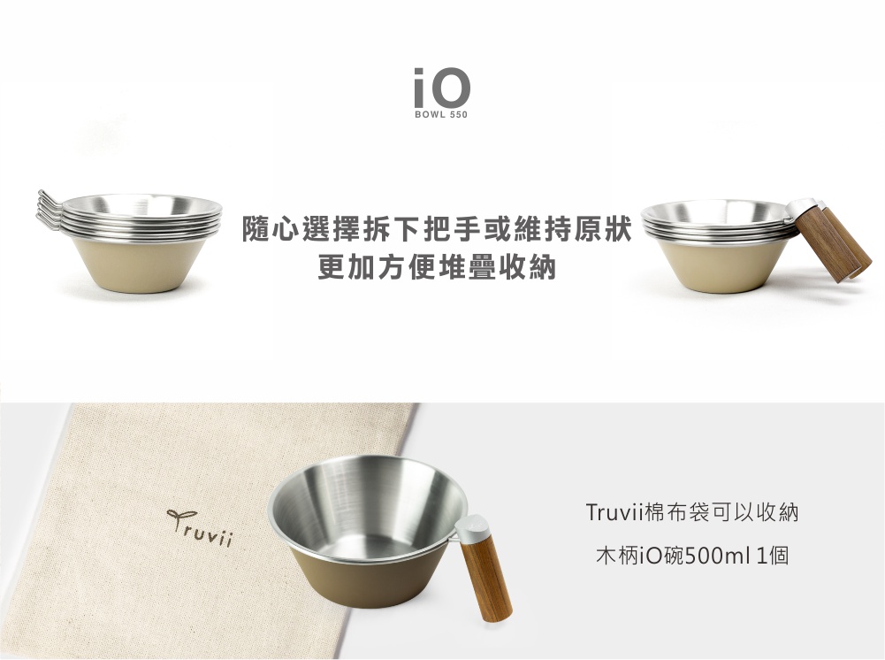 Truvii IO 550碗,可拆式實木把手,錐形設計好疊放收納省空先,304不銹鋼碗體,不管居家或是露營野炊,都好用。